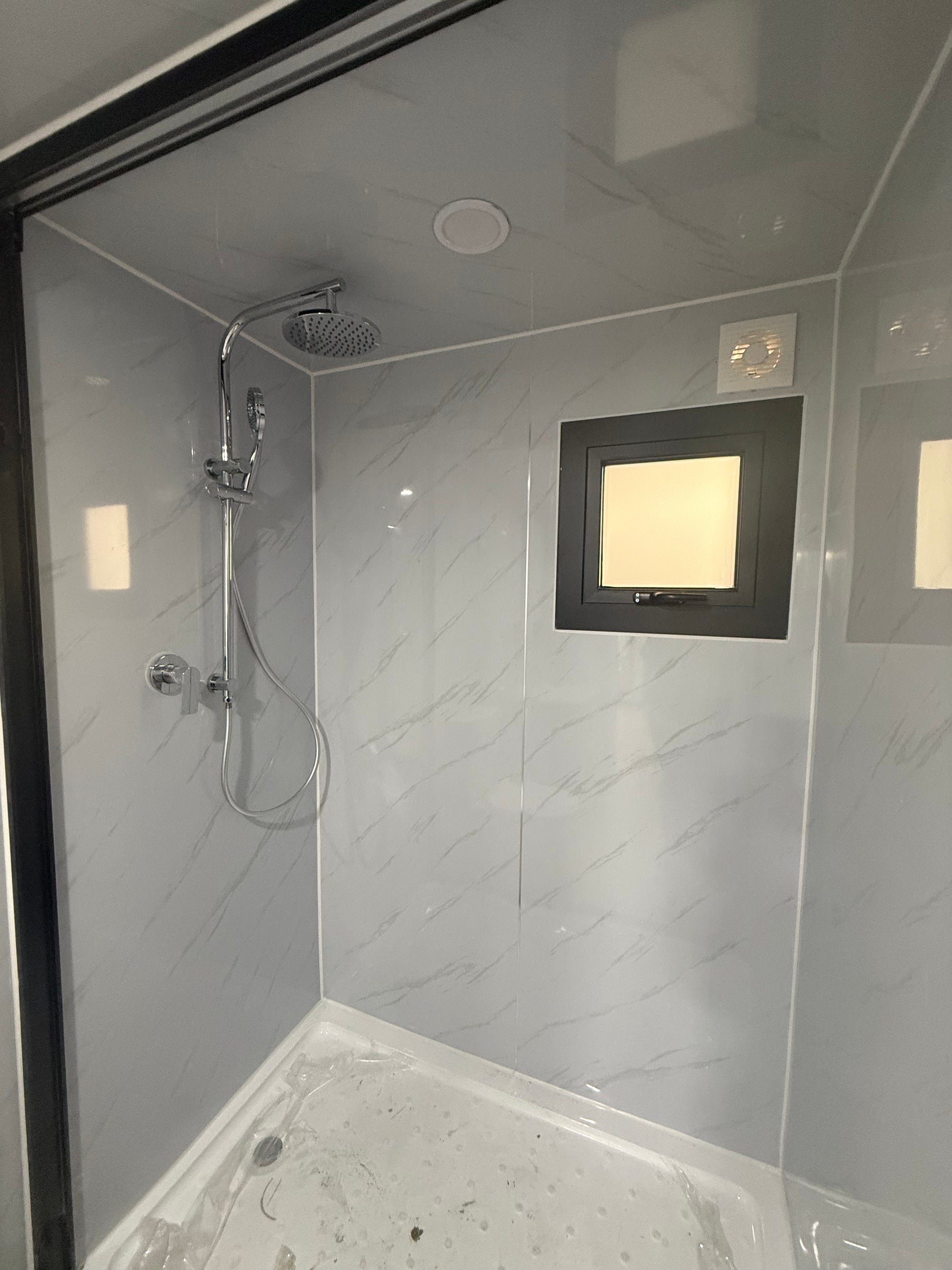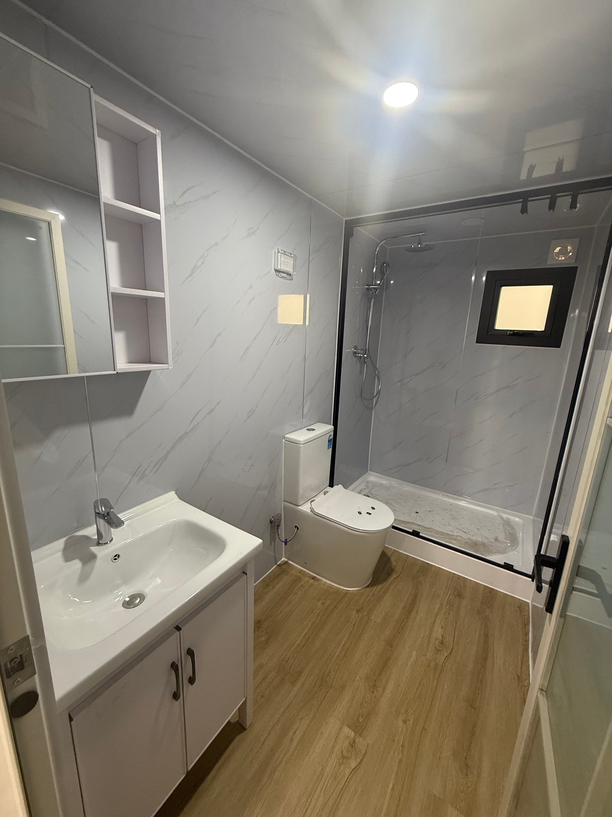 - Marble-patterned PVC wall paneling with an integrated shaving cabinet and mirror.