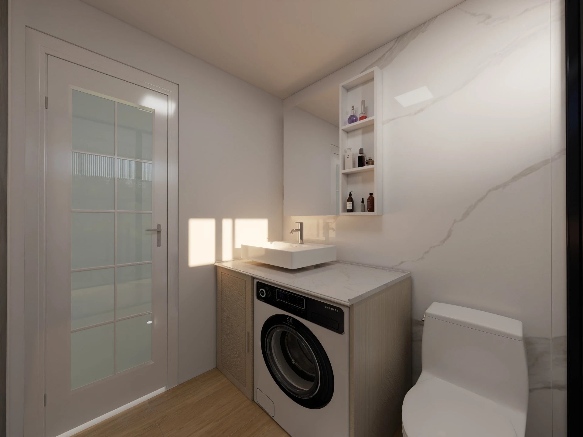 - Marble-patterned PVC wall paneling with an integrated shaving cabinet and mirror.